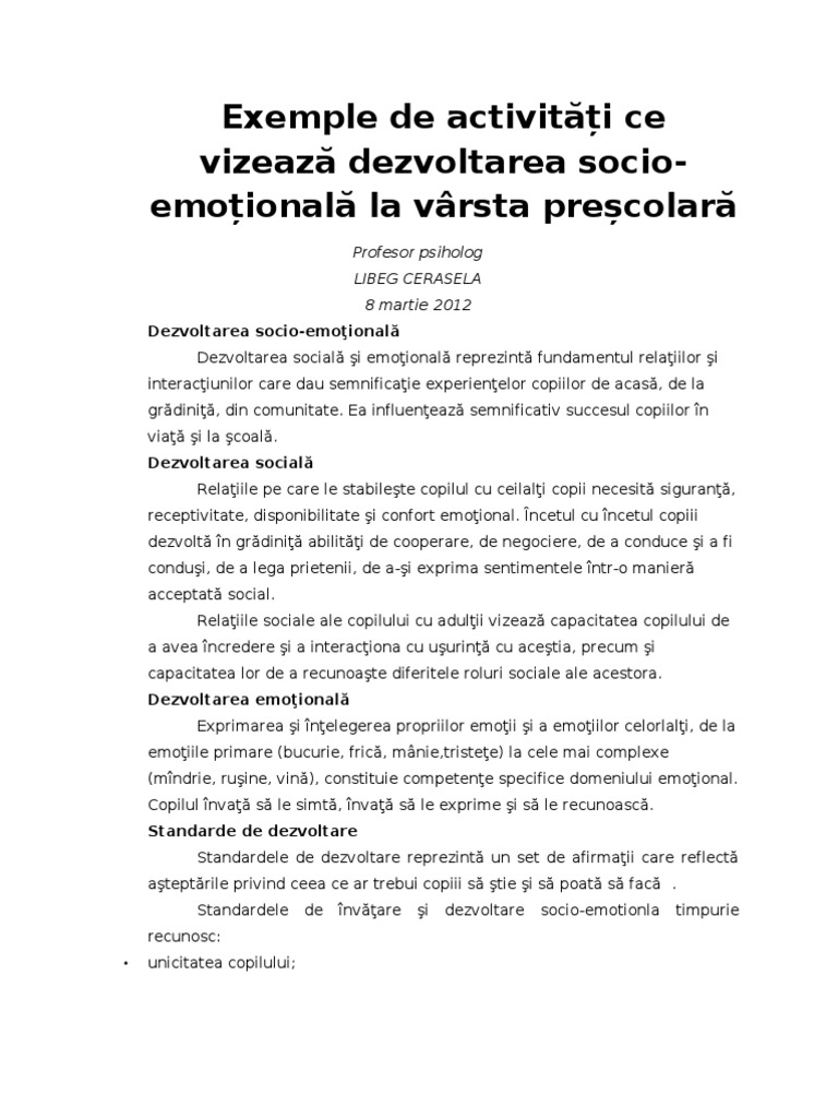 Activitati De Dezvoltare Socio Emotionala La Prescolari