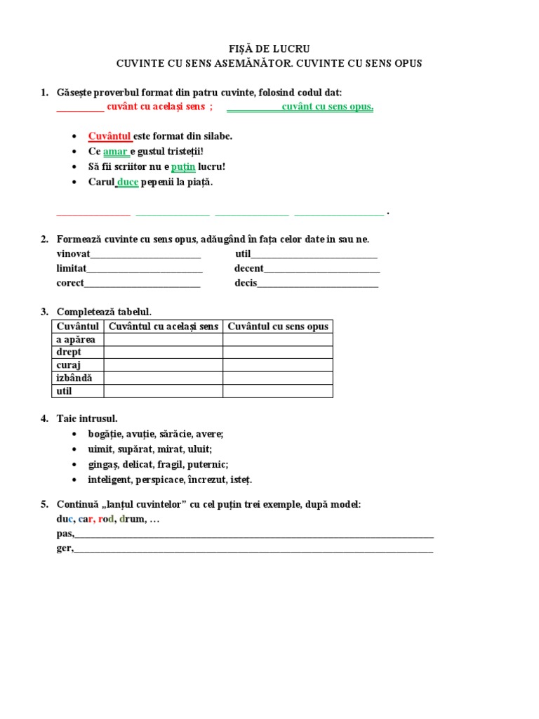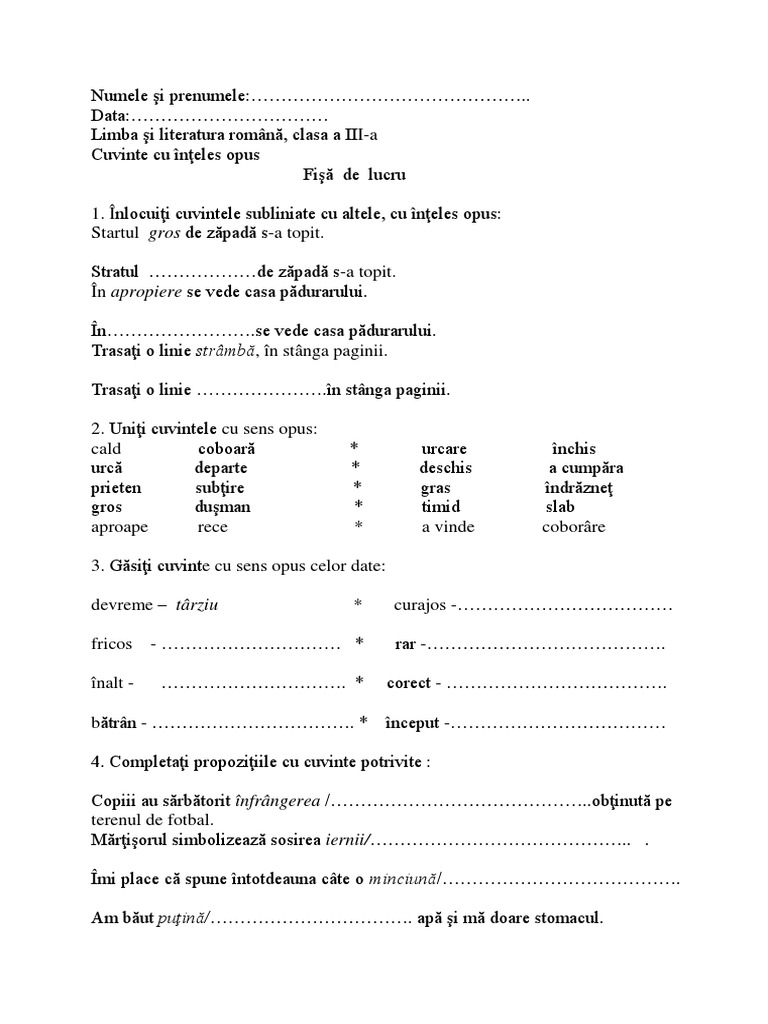 Fisa De Lucru Cuvinte Cu Inteles Opus Cl A Iiia