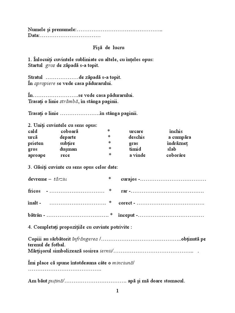 Fisa De Lucru Cuvinte Cu Inteles Opus Cl A Iiia