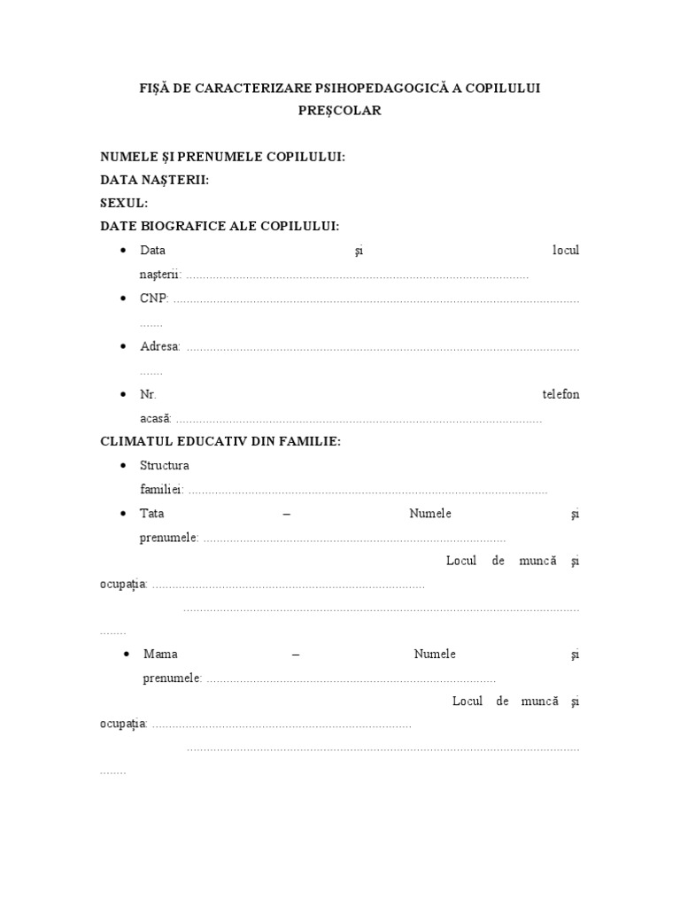 Fisa De Caracterizare Psihopedagogica A Copilului Prescolar