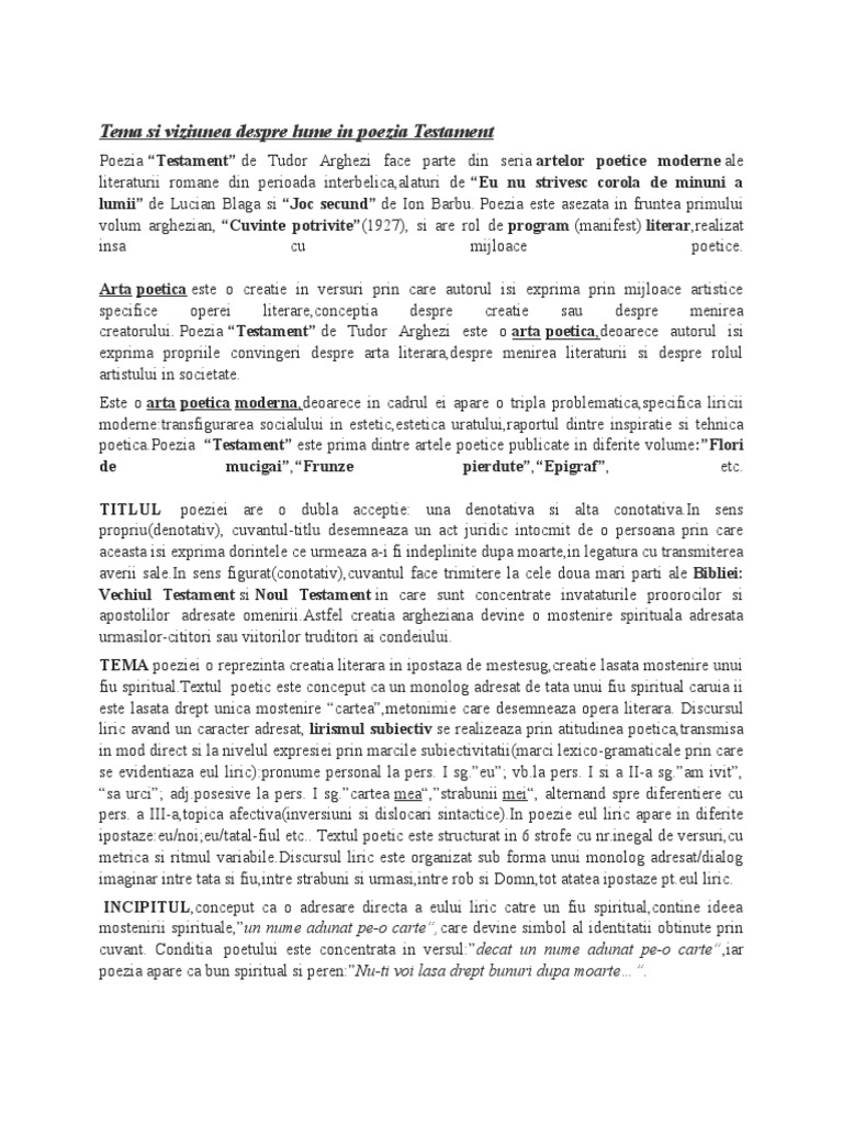 Testament Eseu Despre Tema Si Viziunea Despre Lume
