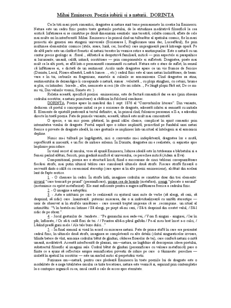 Mihai Eminescu Dorinta Poezia Iubirii Si A Naturii
