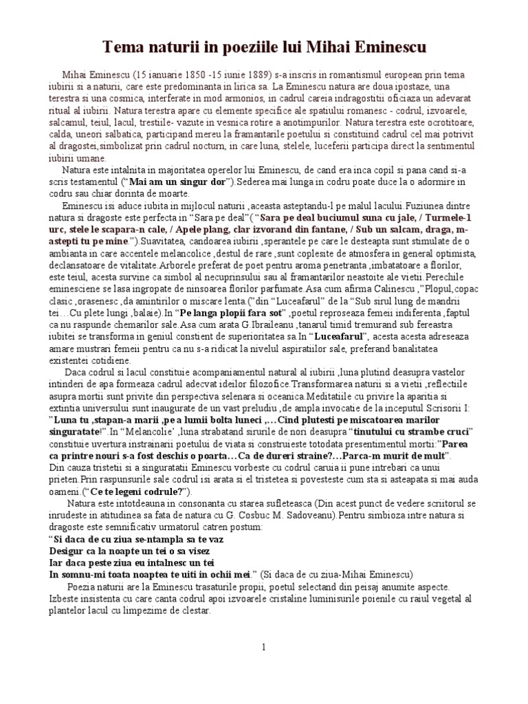 Tema Naturii In Poeziile Lui Mihai Eminescu