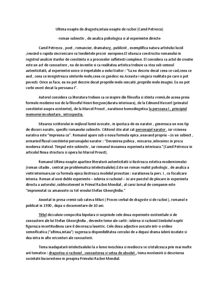 Camil Petrescu Ultima Noapte De Dragoste Intaia Noapte De Razboi Comentariu Bac